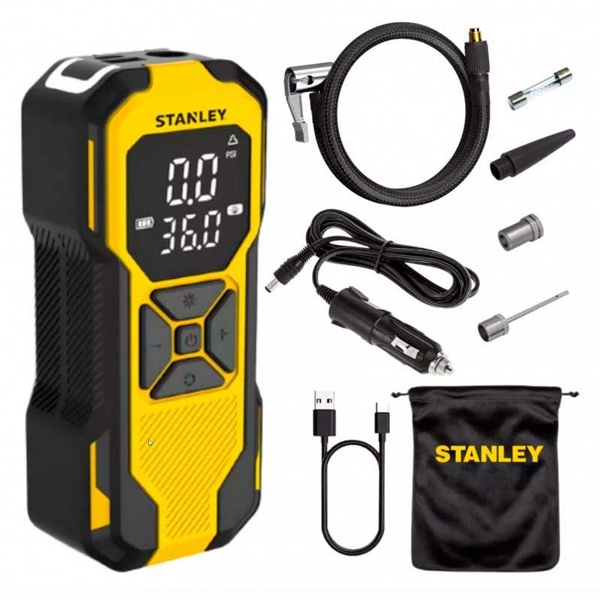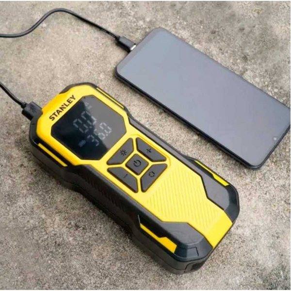 Mini-compresorul de aer fara fir Stanley SXIF0101 este un dispozitiv portabil, echipat cu o baterie Li-Ion, care poate functiona si ca power bank.
