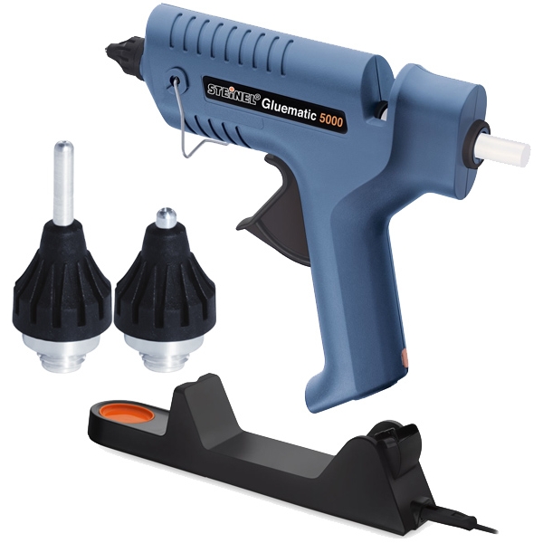 Gluematic 5000 este un pistol de lipit controlat electronic destinat pentru lipirea la cald cu baghete de adeziv 11mm. Usor de utilizat datorita posibilitatii de lucru fara cablu, camera capsulata de topire avand rol de acumulator de caldura. Controlul temperaturii se realizeaza electronic. Putere foarte mare de topire 500W, timp redus de incalzire 3-5min, autonomie mare de lucru, sistem de avans mecanic al adezivului pentru lipire cursiva si dozare corecta, temperatura topire 210°C-200°C. Alimentare si incarcare automata prin suportul de incarcare, functioneaza in regim economic de asteptare cu timpi scurti de incalzire, capacitate lipire cca.22g/min, greutate 330 g (fara suport). Functionare continua prin simpla conectare a cablului de alimentare la pistolul de lipit.