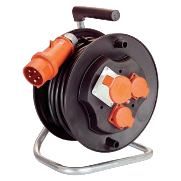 Tambur de cablu, cu siguranta, 400V CEE, din material plastic special, robust, cu rezistenta mare la rupere, suport zincat, antisoc, stabil, frana de blocare, maner cu forma ergonomica, comutator de protectie termica VDE cu 3 poli si cu functie automata, dotat cu 2 prize impamantate 230 V cu capace de siguranta si simbol de ciocan , 1 priza CEE 5 poli 400 V 16A. Ambalat in cartoane care pot fi stivuite, marcat cu serie EAN si descriere.