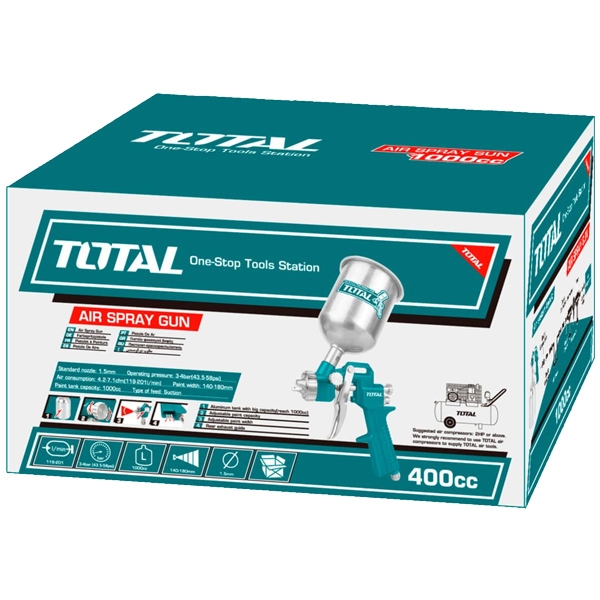 | Informatii suplimentare | Latime: 180-250 mm Capacitate vopsea: 0.4 L Duza optionala: 1.5-2 mm Presiune de lucru: 3-4 bar Presiune maxima: 8.3 bar Consum aer: 119-201 l/min Nivel de putere sonora: 88.4 dB(A) |
