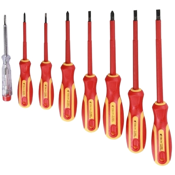 Setul de surubelnite pentru electricieni Troy este alcatuit din 8 piese de calitate superioara. Surubelnitele din acest set au lame crom vanadiu.