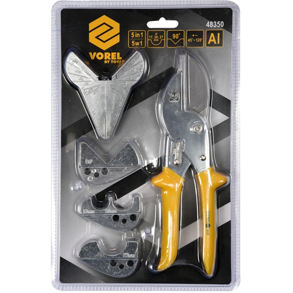 Foarfeca multifunctionale destinate taierii furtunelor, tevilor, fasiilor si a altor materiale tehnice.