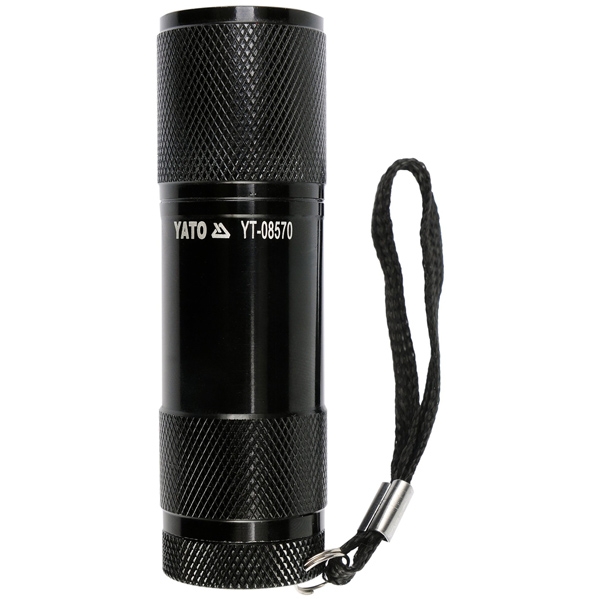 Carcasa din aluminiu, snur textil si alimentata cu baterie.