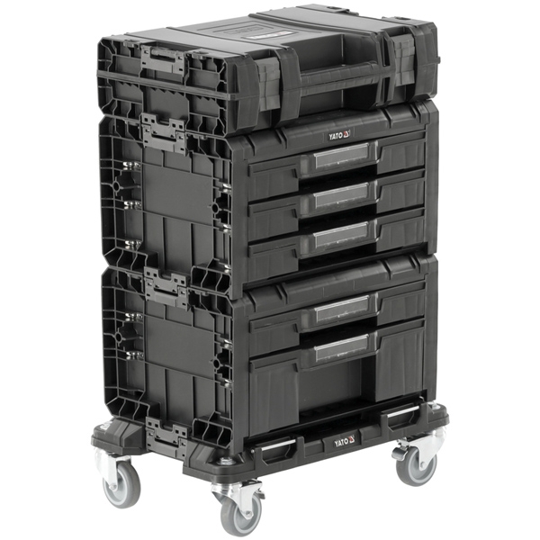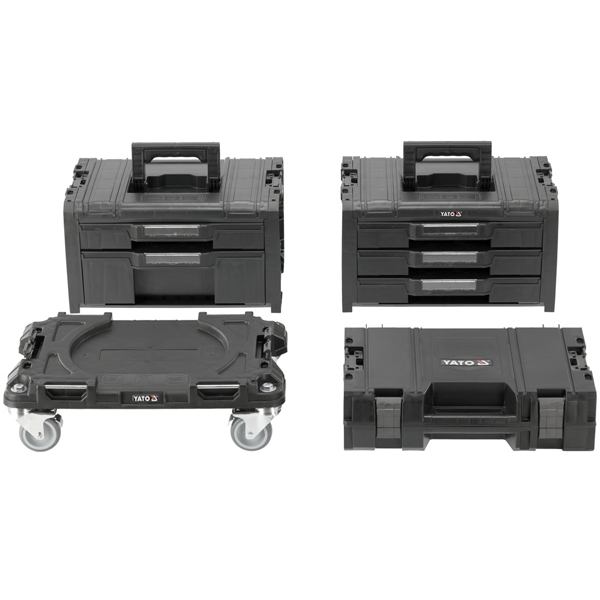 Setul cu patru piese este un atelier mobil, un carucior de atelier sau un dulap multifunctional. Este format dintr-o platforma cu roti (P05 S12), o cutie cu doua sertare (T2 S12), o cutie cu trei sertare (T3 S12) si o cutie universala pentru scule electrice (41G2 S12). Constructia solida permite transportul cutiilor cu o greutate maxima de 100 kg. Rotile metalice pivotante, echipate cu frana, asigura o manevrabilitate excelenta a intregului ansamblu.