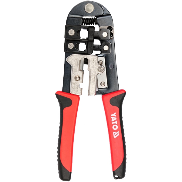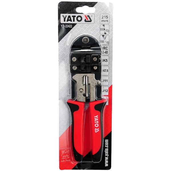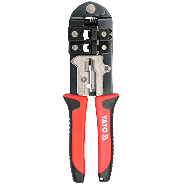 Cleste Yato YT-22422 pentru sertizarea bornelor de telefon si de retea, cu suprafata innegrita care protejeaza impotriva coroziunii si manere din plastic bicomponent.